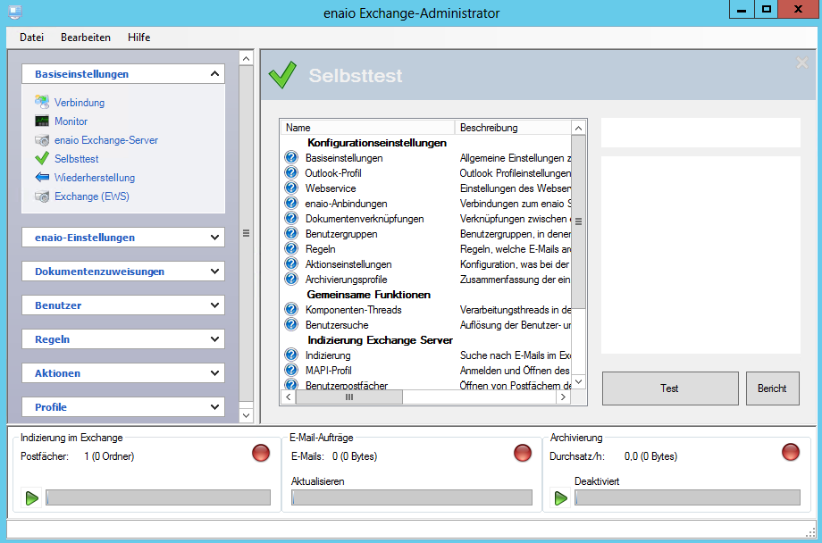 Sie können die Konfigurationen testen. Der Test listet die Ergebnisse auf. Markieren Sie einen Eintrag, werden Details eingeblendet.