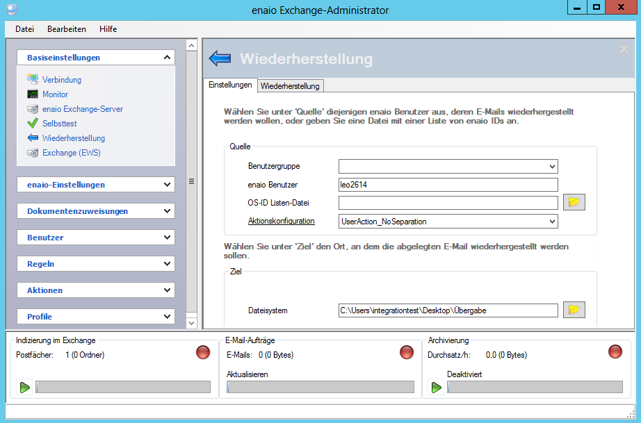 Abgelegte E-Mails können wiederhergestellt werden. Wiederhergestellt werden können alle E-Mails von einzelnen Benutzern, von Benutzergruppen, oder E-Mails nach einer Liste von IDs. Angegeben werden muss die Aktion, über die die entsprechenden E-Mails abgelegt wurden.