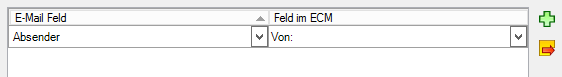 Klicken Sie auf die grüne Plus-Schaltfläche, um eine Zuordnung anzulegen. Im Bereich E-Mail Feld wählen Sie dann ein Kenndatum, im Bereich Feld im ECM geben Sie dann ein Indexdatenfeld an.