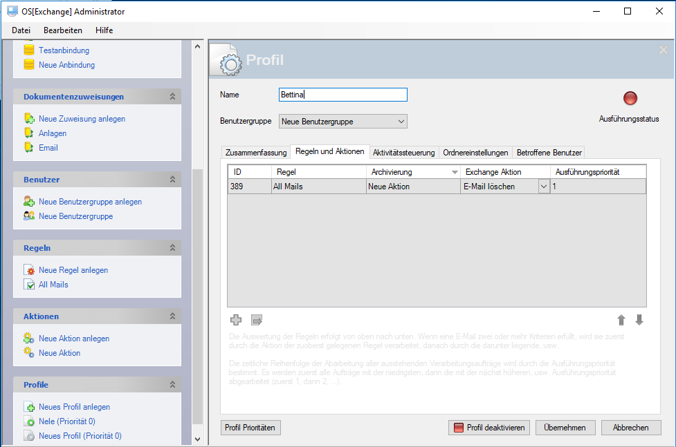 Über diesen Bereich fügen Sie die vorangehenden Konfigurationen von Dokumentenzuweisung, Benutzergruppe, Regeln und Aktionen zu einem Profil zusammen, das zeitgesteuert oder aus dem enaio® exchange-administrator ausgeführt werden kann.