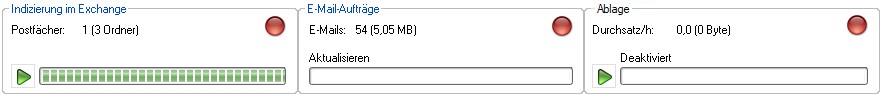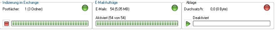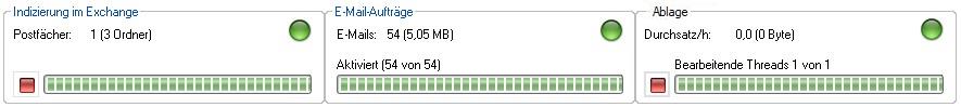 Klicken Sie auf die Start-Schaltfläche im Bereich Indizierung in Exchange, wird die Übernahme gestartet und E-Mails entsprechend der Regeln in das temporäre Verzeichnis übertragen. Im Bereich Indizierung in Exchange und im Bereich E-Mail-Aufträge wird der Verlauf angezeigt.