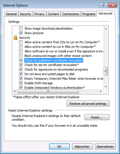 Beim Start werden Zertifikate überprüft. Ohne Internetverbindung können Sie diese Überprüfung über die Internetoptionen des Microsoft Internet Explorers ausschalten, da der Start sonst deutlich verzögert wird.