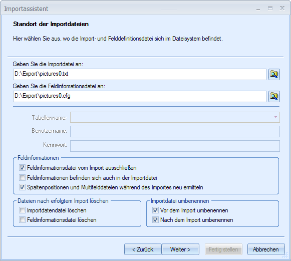 Falls die Feldinformationsdatei selbst dem Schema entspricht, das Sie über Platzhalter bei der Angabe der Importdateien eingeben, müssen Sie diese Option markieren.