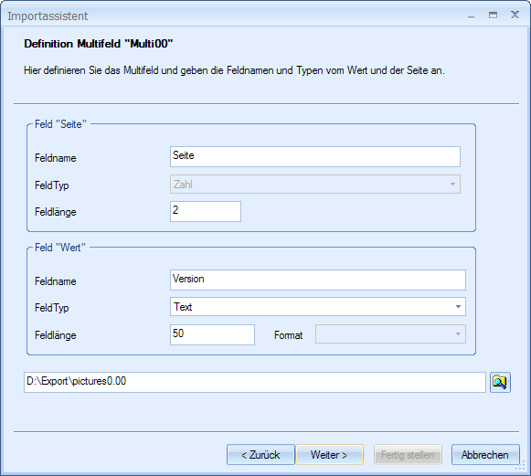Für jedes Feld, das Sie als Mehrfachfeld gekennzeichnet haben, wird die Formatbeschreibung der Mehrfachfelddatei ausgelesen. Die Daten können Sie korrigieren.