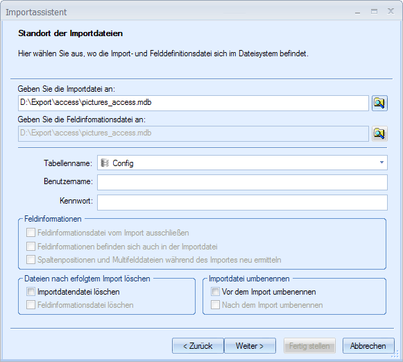 Sie geben die Datei an und wählen über das Feld Tabellennamen die Tabelle mit den Daten aus.