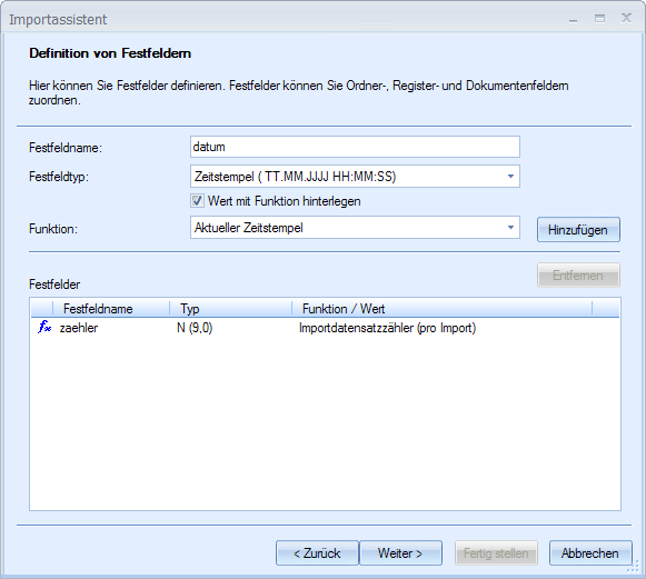Mit Festfeldern geben Sie Daten an, die beim Import jedem Datensatz hinzugefügt und einem Objektfeld zugeordnet werden.