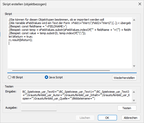 Über den Button Importbedingung können Sie für den markierten Objekttyp ein Importbedingungs-Skript, VB Skript oder Java Script, einbinden.