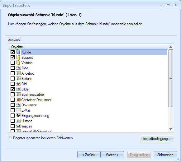 Durch diese Importbedingungs-Skripte können heterogene Datensätze, die in einer Importdatei vorliegen, auf unterschiedliche Objekttypen verteilt werden.