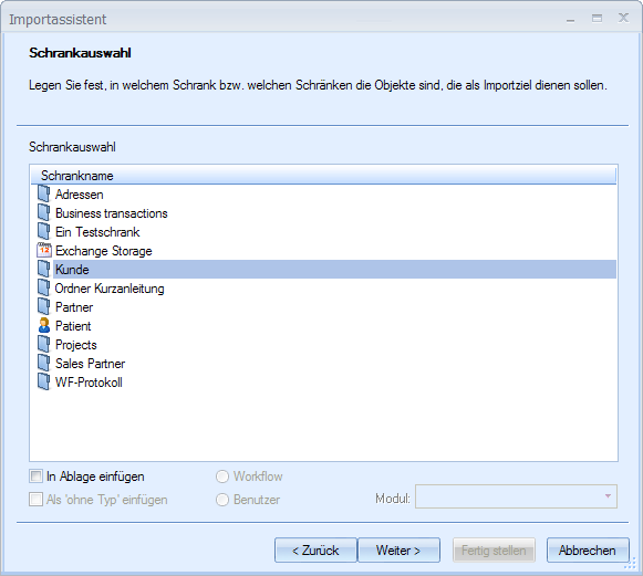 Die Objektauswahl beginnt mit dem Dialog Schrankauswahl, Sie geben einen oder mehrere Schränke an, denen die Objekte zugeordnet sind, die Sie erzeugen wollen.