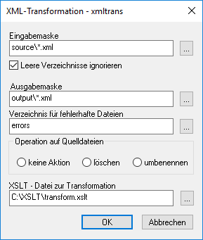 Über das Feld Eingabemaske geben Sie die XML-Datei an, die transformiert werden soll. Sie können den Platzhalter '*' verwenden, wenn Sie mehrere Dateien transformieren wollen.
