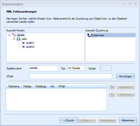 Der folgende Dialog XML-Feldzuordnung zeigt die Unterknoten des gewählten Importknotens an.