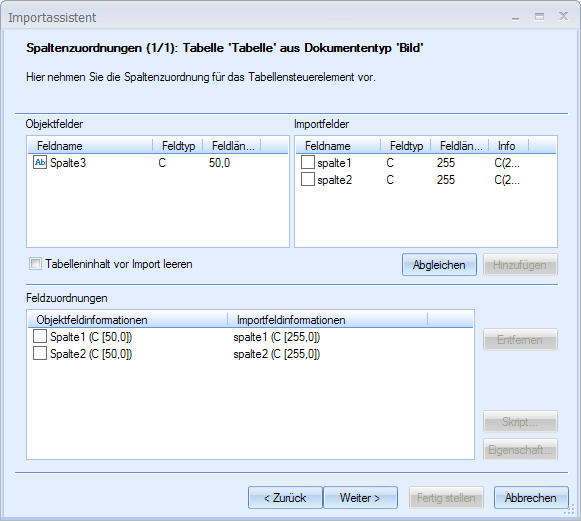 Zuletzt ordnen Sie den Spalten des Objektfeldes 'Tabelle' die Spalten der Importfelder aus dem Dialog Tabellensteuerelement - Spaltendefinition zu.