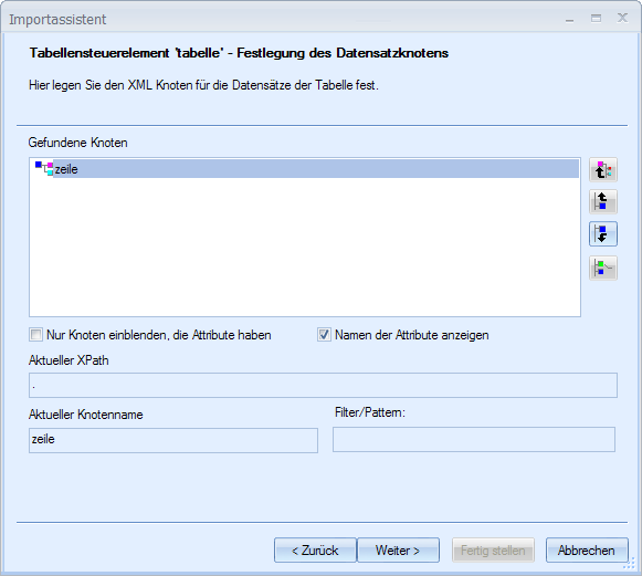 Der Importassistent liest die Datei und zeigt im Dialog Festlegung des XML-Importknotens die Knoten in der Importdatei an: