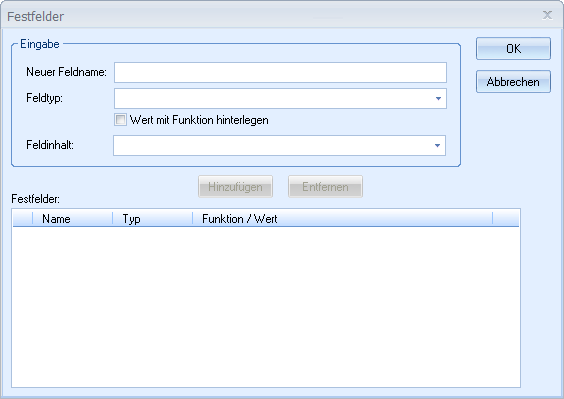 Sie geben Feldnamen, Typ und Inhalt an. Sie können Funktionen verwenden, über die der Inhalt erzeugt wird. Über den Button Hinzufügen übertragen Sie die Daten in die Liste der Festfelder.