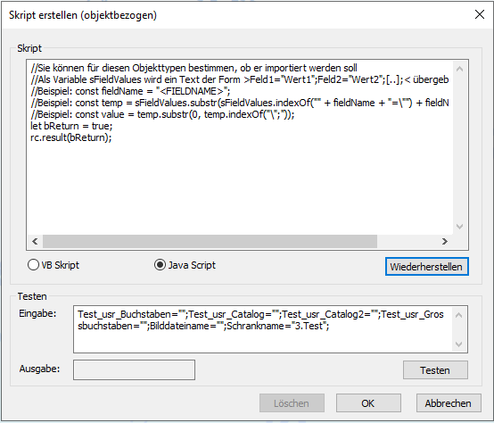 Wenn Sie den Skriptinhalt löschen und auf Wiederherstellen klicken, dann wird das Beispielskript in der jeweils ausgewählten Skriptsprache neu eingelesen.