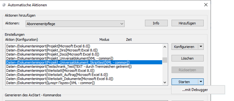 Beim Ausführen des Imports über den Konfigurationsdialog für Automatische Aktionen werden nur die Datensatzskripte automatisch im Debugger angehalten. Der Modus ... mit Debugger kann für die Konfiguration und für das Starten gewählt werden. Im Modus Konfigurieren mit Debugger werden die Objekttypskripte und die Feldskripte beim Testen des Skriptes automatisch im Debugger angehalten. Im Modus Starten mit Debugger werden nur die Datensatzskripte automatisch angehalten.