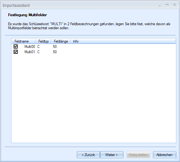 The column in the format description must be named Mutli00 so the import recognizes that the data in the data file refer to a multi-field file. For more than one multi-field, the numbers are increased in hexadecimal notation, meaning that a second column containing data for a multi-field must be named Multi01.
