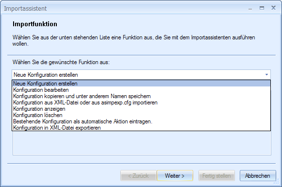 The import wizard reads in existing configurations from the database at startup and lists them.