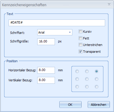 Then set the font properties and the position. The position is specified graphically: left-aligned, right-aligned, or centered. You can have the label moved a specified number of millimeters from a selected position on the frame towards the center of the image.