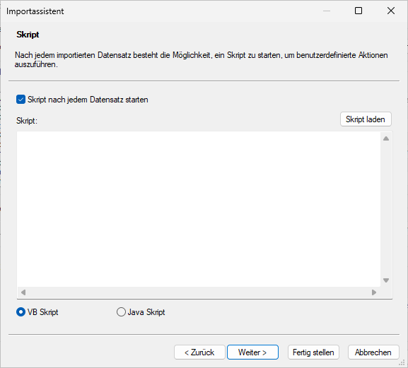 In the dialog, enable Start script after each record and enter the script or upload a script from the file system.