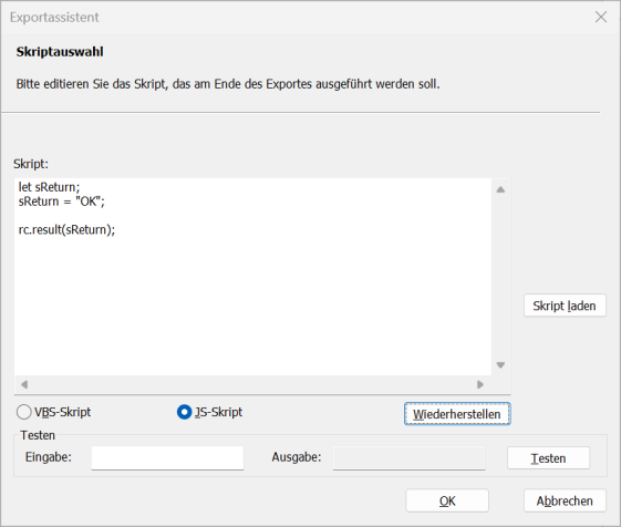 If you select this option, you can open the Script selection dialog during Field Selection. It is specified whether a VBScript or a JavaScript is integrated.