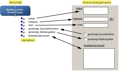 Eine Anwendung ordnen Sie einer oder mehreren Aktivitäten zu. Bei der Konfiguration der Aktivität geben Sie an, welche Variable welchem Übergabeparameter zugeordnet wird. Bei Dialogelementen als Übergabeparametern geben Sie also an, welche Variable in der Aktivität über welches Dialogelement bearbeitet werden kann.