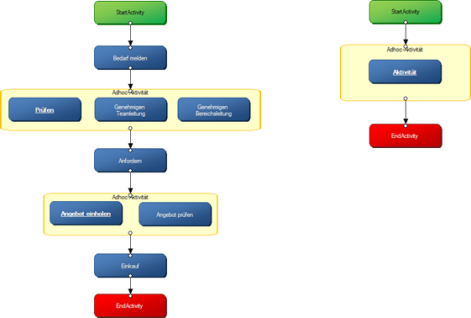Eine Ad-hoc-Aktivität ist ein Bereich, in dem andere Aktivitäten angeordnet werden. Diese Aktivitäten sind nicht durch Transitionen verbunden. Die Transitionen legt der Benutzer im Verlauf des Vorgangs in enaio® client fest.