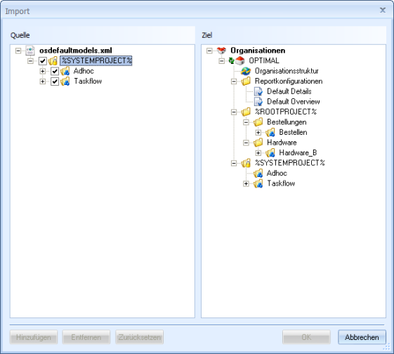 Markieren Sie im Bereich Quelle den Eintrag 'Systemprojekte' und im Bereich Ziel 'Organisation'.