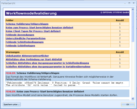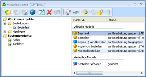 Only active models in the active organization can be used in enaio® client. Only one of a workflow family's models can be activated. A model is automatically checked before its status is set to 'active'. If errors are found, the model will not be activated.