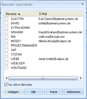 All enaio® users are listed. The option Only active users only shows users whose account was not locked in enaio® administrator.