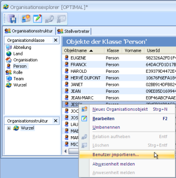 Objects of the 'Person' class can simply be transferred from the enaio® user administration. Open the import dialog by choosing Import user from the context menu.