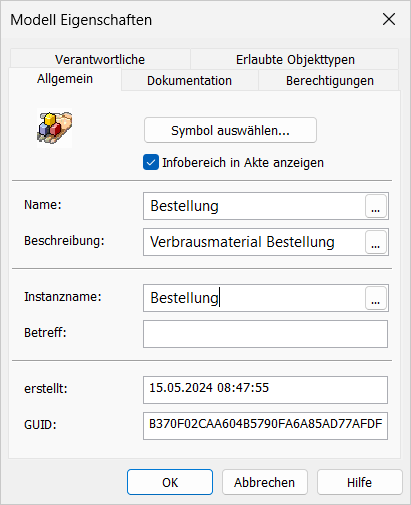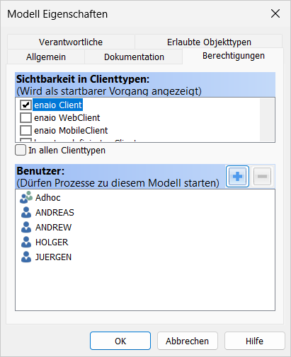 Persons or roles that can start a model's process or object types that can be assigned to the model are managed in the model properties.