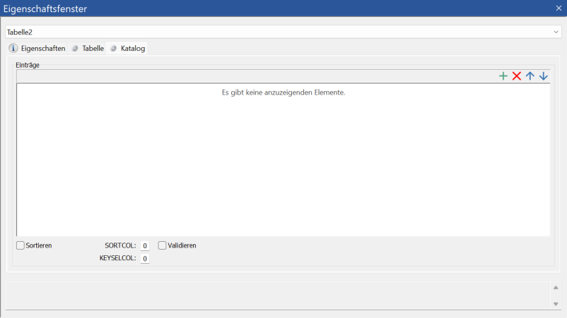 On the Catalog tab, enter the list values for the selected column in the field row by row. A new line is added by clicking the + icon or the Ins key. List values can be moved up and down using the arrow icons. Use the button or the x icon to delete rows.