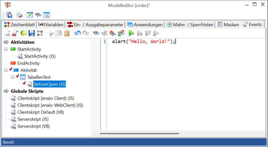 Client scripts and server scripts can be in JavaScript or VBScript. JavaScript is recommended. Scripts for enaio® webclient must be in JavaScript.