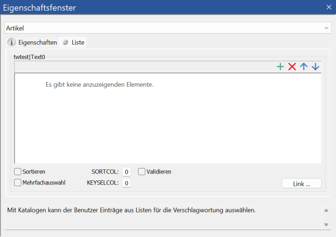 If you want to sort list catalogs, you can do this based on the value in the first column or the list entry in the second column. The value of the first column is set to (SORTCOL=0) by default. The sorting can be placed on the list entry of the second column: SORTCOL=1. The preselection for entries via keyboard can be to consider only the first column (KEYSELCOL=0, default), only the second column (KEYSELCOL=1), or both columns (KEYSELCOL=2).