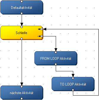 In addition to a starting and an end point, loop activities offer a loop exit and a loop entry for the loop transitions. Transitions from a loop exit to an activity entry have the property 'FROM LOOP', whereas transitions from an activity exit to a loop entry have the property 'TO LOOP'.