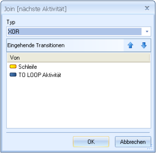 If you set up multiple transitions to the starting point of an activity, you can use an XOR join to specify that a preceding activity with a true transition condition or without conditions is sufficient to run the next activity. Although the other preceding activities can still be executed, they are irrelevant to the transition.