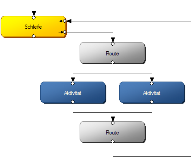 Loops additionally have a loop exit and a loop entry for loop transitions. Transitions from a loop exit to an activity entry have the property 'FROM LOOP', whereas transitions from an activity exit to a loop entry have the property 'TO LOOP'. The loop passes the data through the 'FROM LOOP' transition and receives it back through the 'TO LOOP' transition. The loop will not forward data through the end point until the data fulfills the exit condition.