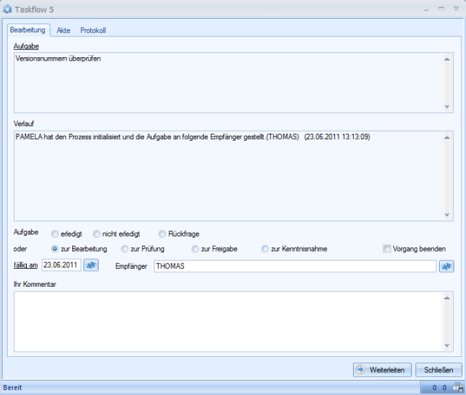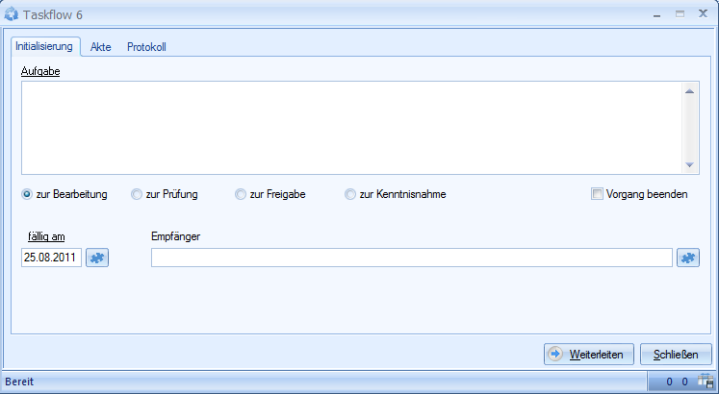 However, the taskflow consists of only one step that can be quickly executed and forwarded to a recipient. The recipient processes this step. Forwarding then returns the step to the sender. The recipient can include other recipients, thus becoming in this context the sender to whom the step is returned.