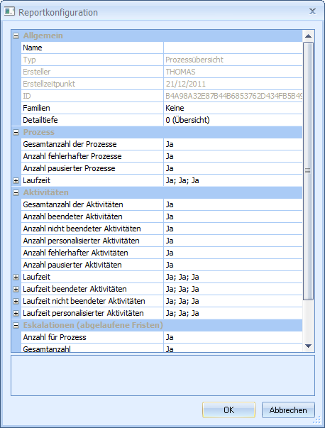 For the overview configuration, specify a Name, specify whether the processes of all Families or only individual families are included, and specify the Level of detail: Overview, Itemized list of each family, or Itemized list of each family and activity. To do so, you can switch on/off the inclusion of individual data in detail (true/false). |
