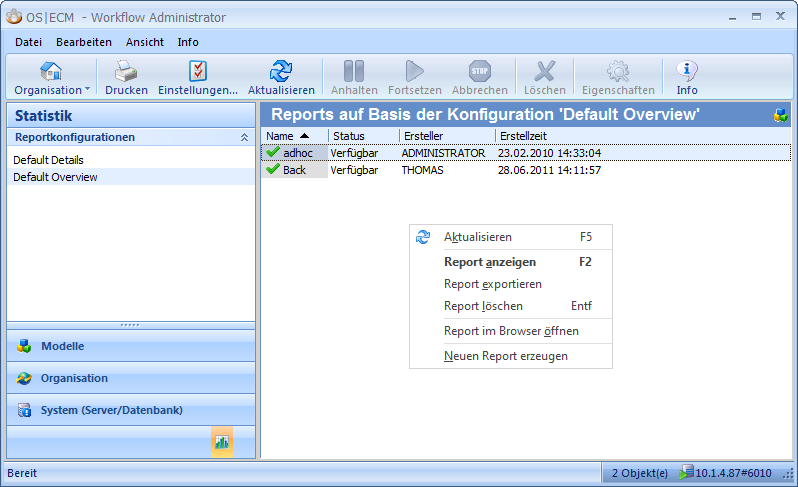 A report can be configured, created, and opened via the Statistics area based on a detail or overview configuration. Reports are created in the preset application language.