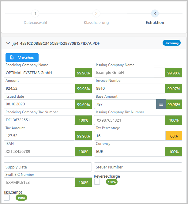 Die Maske Extraktion wird angezeigt. Die extrahierten Indexdaten werden jeweils mit ihren Wahrscheinlichkeiten angezeigt. Eine Angabe von 99 % bedeutet z. B., dass die KI den Wert zu 99 % richtig erkannt hat. Das Symbol