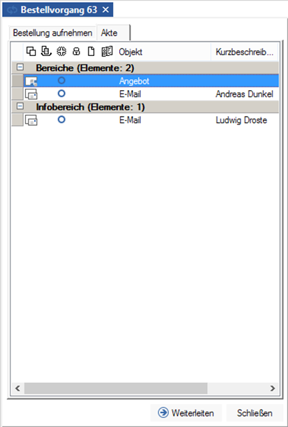 Like in hit lists, objects in the record are flagged with their type-specific icons, while documents are also flagged with archiving and status icons. In the properties of an object, you can view the workflow processes that object is part of, regardless of the file in which it is located.