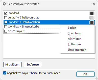 You can manage the saved layouts in the window layout management. You can open the window layout management via ENAIO ribbon tab > Window layout or by double-clicking the window layout name shown in the status bar.
