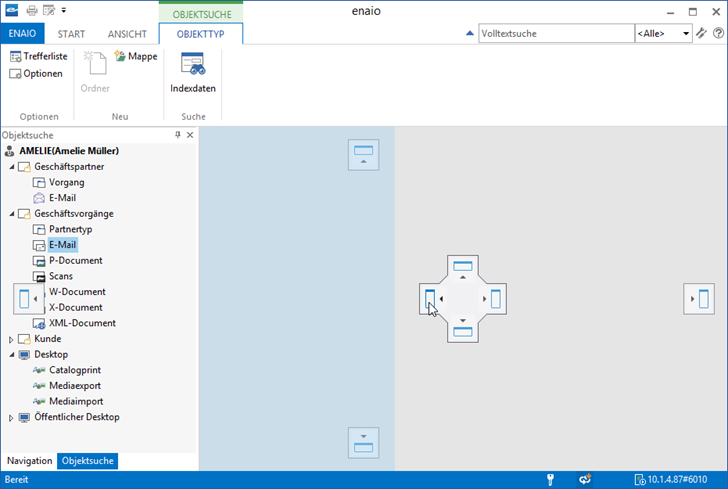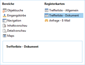 Le positionnement des éléments principaux flexibles du volet de travail, à savoir la fenêtre de résultats, la recherche d'objet, la navigation, les boîtes de réception et le contenu ou l'aperçu du contenu, peut être modifié individuellement et indépendamment les uns des autres. Vous pouvez enregistrer jusqu'à cinq de ces mises en page de la fenêtre (voir Mise en page de la fenêtre).