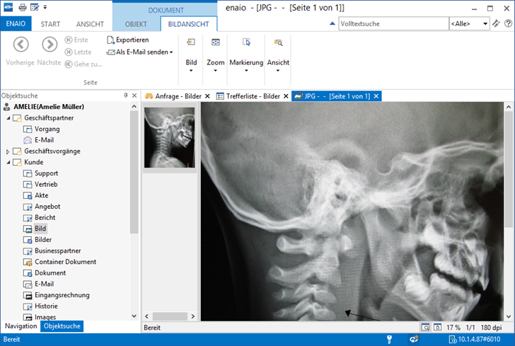 L'interface utilisateur d'enaio® client comprend une barre de titre, une barre de menu et une barre d'état dans la fenêtre principale externe et le volet de travail interne. La disposition et l'affichage des éléments principaux sur le volet de travail sont très flexibles. La détermination des paramètres dépend des autorisations accordées à chaque groupe d'utilisateurs par l'administration système.