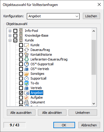 Saisissez une désignation dans le champ Configuration, marquez les objets souhaités à inclure dans la recherche en texte intégral et validez en cliquant sur OK.