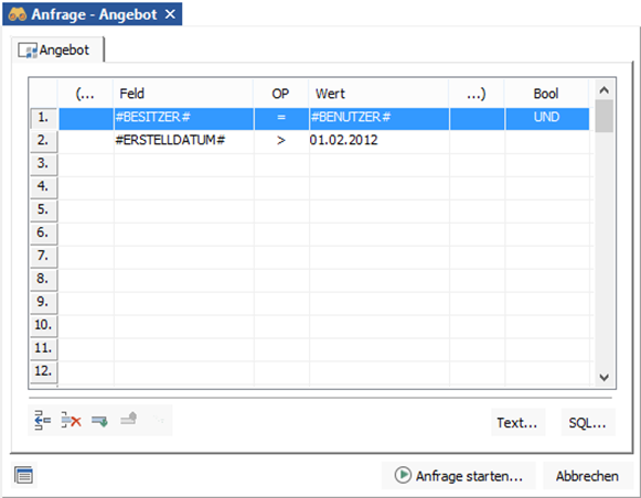 Dans la colonne Champ, les listes contiennent les champs de données d'indexation, dans la colonne OP les opérateurs, dans la colonne Valeur les valeurs correspondant au champ de données d'indexation et dans la colonne Bool les opérateurs booléens. Les listes de la première et de la cinquième colonne contiennent des parenthèses.