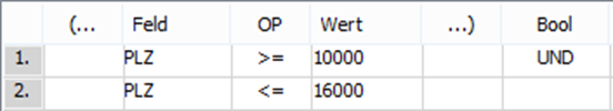 Par exemple, vous pouvez recherchez tous les classeurs des clients de la région de Berlin, c’est-à-dire dans la plage de codes postaux de 10000 à 16000.
