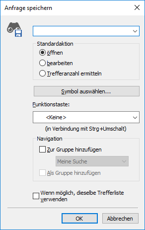 Avec les cases d'option Ajouter au groupe et Ajouter comme groupe, vous pouvez spécifier si la requête enregistrée est ajoutée non seulement dans la zone du bureau mais aussi à la navigation.
